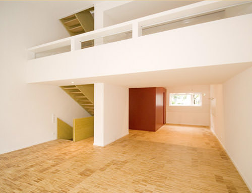 Im Haus S wird auf schmalem Grundstück ein Raumkonzept realisiert, das – dem Split-Level folgend – auf fünf Ebenen vielseitige Wohnqualitäten für eine sechsköpfige Familie bietet: großzügige Gemeinschaftsflächen und -volumen sind mit kleinen Einzelräumen für jedes Familienmitglied kombiniert. Schon beim Eintritt in das Gebäude fällt der Blick über die großzügige Süd-West-Verglasung bis in den rückwärtigen Garten. Ein besonderes Merkmal sind die variierenden Decken- und Raumhöhen, die bei fließenden Übergängen Koch-, Ess- und Sitzbereich definieren. Dieser offene Wohnbereich ist mit der Galerie verbunden, die im Rückzug zum Spielen, Arbeiten oder [Gäste-] Wohnen genutzt wird. Auf den drei folgenden, wechselseitig zur Straße und zum Garten orientierten Ebenen befinden sich die Einzelräume sowie zwei Bäder. Ändern sich die Wohnbedürfnisse, können auf den beiden obersten Ebenen später zwei große Räume entstehen, einer davon als Studio unter dem Dach.